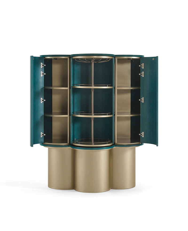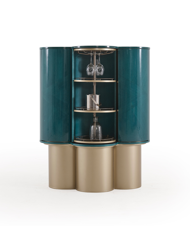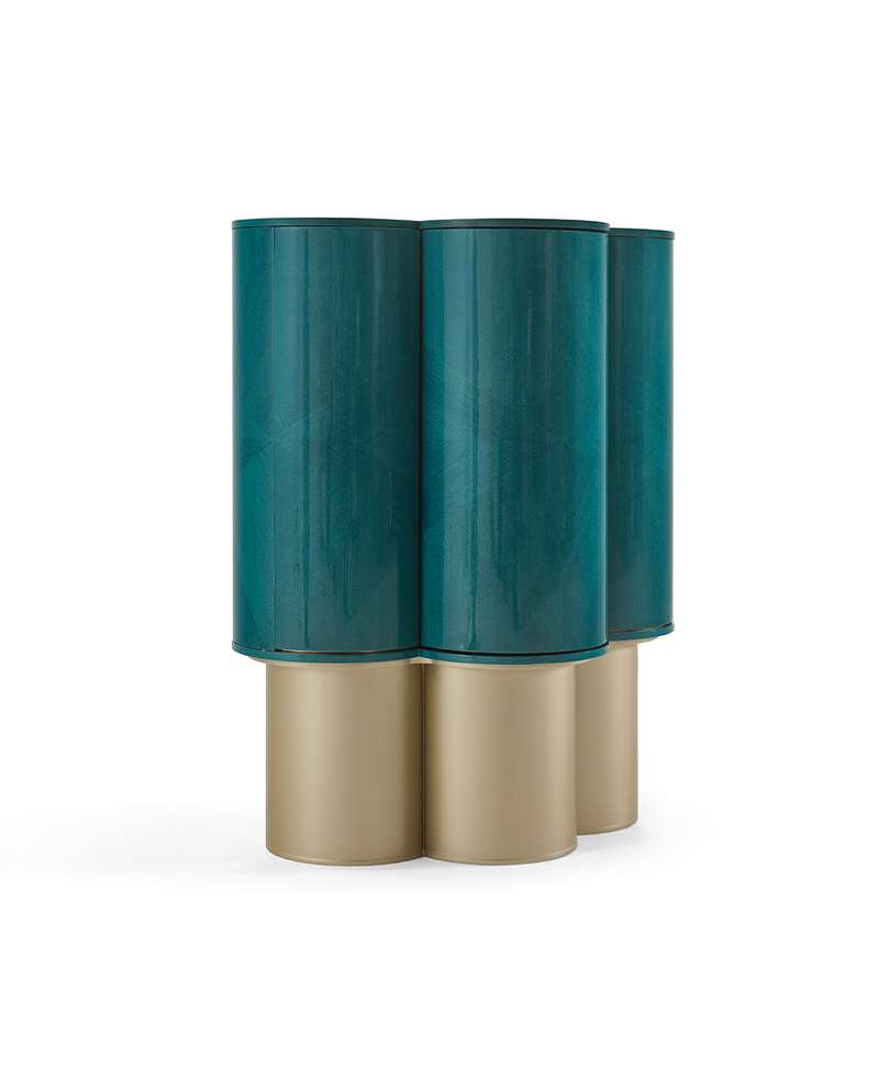 Inspired by the ancient symbolism of turquoise, this sculptural Azura Cabinet reinterprets tradition through a bold and enveloping form. Its curved body is defined by a rhythmic surface pattern that radiates across the turquoise veneer, creating depth, movement, and a refined visual texture. Elevated on cylindrical metallic bases, the composition achieves a balanced dialogue between solidity and fluidity, subtly referencing the droplet motif that informs its design. The turquoise finish carries a legacy of protection and harmony, introducing calm and continuity into the space it inhabits. Designed with a quiet luxury sensibility, it offers a timeless character that brings meaning, material richness, and enduring elegance to contemporary interiors.